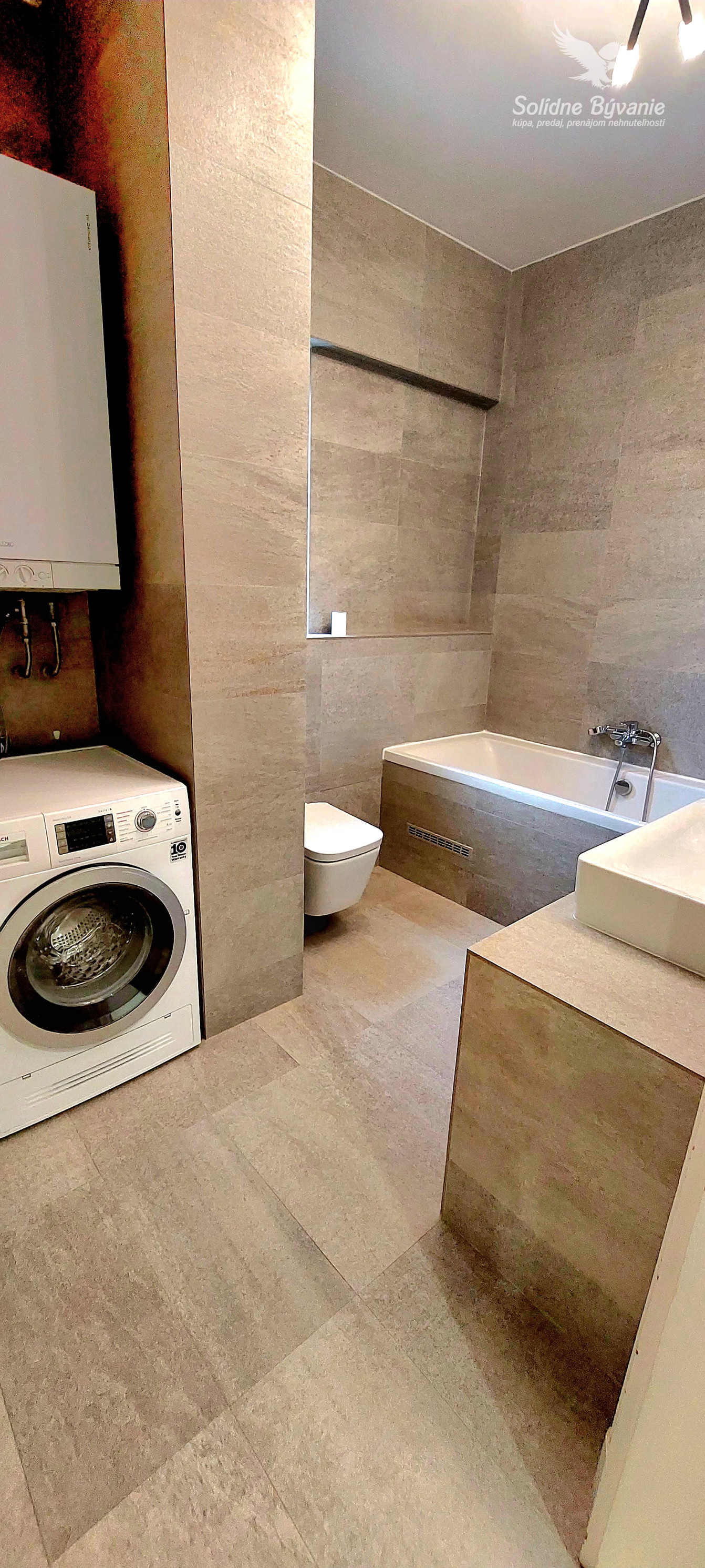 • kúpeľňa je vybavená aj vaňou, sprchovým kútom a práčkou